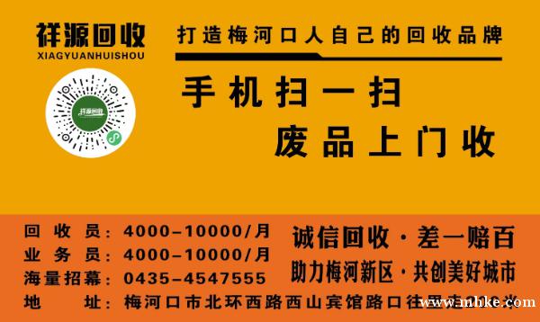 祥源回收大量招募回收員,(上門回收廢品)要求身體健康,需要溝通能力強,會使用智能手機,會騎電動三輪車,熟悉街區(qū)道路。預(yù)計工資4000到10000元。聯(lián)系電話:0435-4547555 聯(lián)系我時,請說是在梅小網(wǎng)看到的,謝謝!
